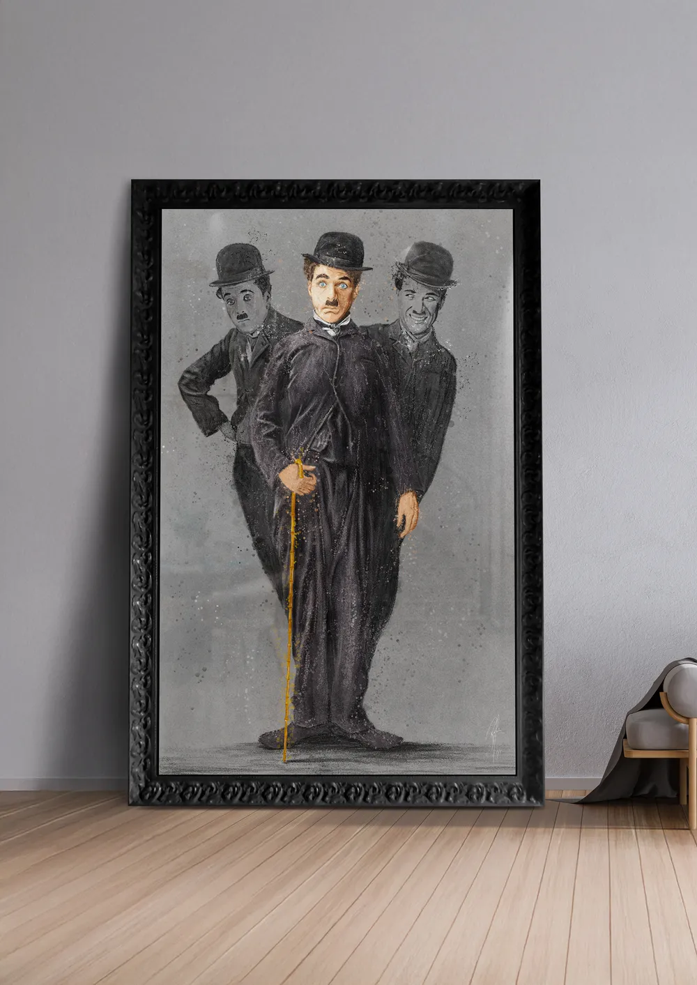 In this striking life-size painting, I pay tribute to the iconic Charlie Chaplin by capturing three distinct moods that embody his genius - This masterpiece not only celebrates Chaplin’s artistic legacy but also invites viewers to connect with the rich emotional spectrum he portrayed throughout his life.